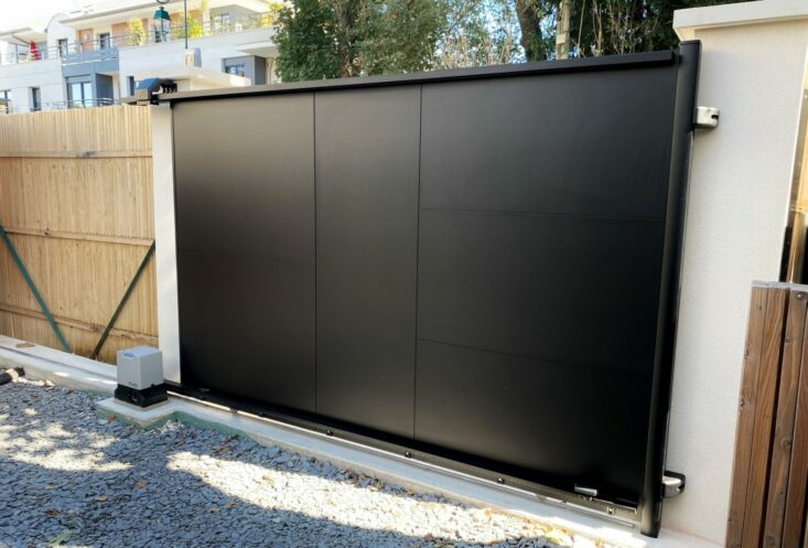 Pose d'un magnifique portail coulissant marque KOSTUM by Cadiou, dans le 92. Ce portail de la Collection Archy, modèle ESUS allie design contemporain et fonctionnalité. Pour plus de confort nous avons également posé une motorisation FAAC 740 (moteur pour portail résidentiel jusqu'à 500kg).